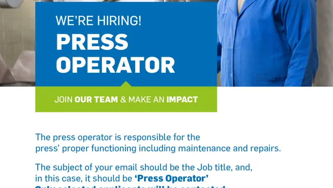 The subject of your email should be the Job title, and, in this case, it should be ‘Press Operator’